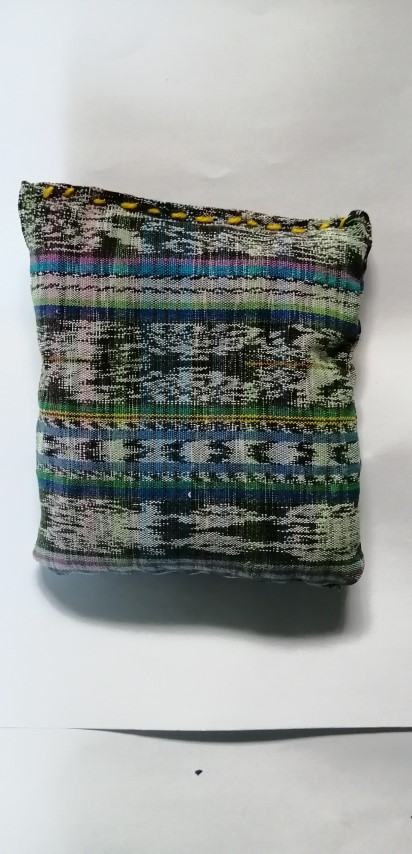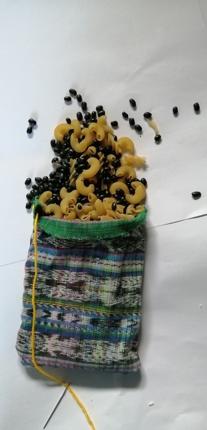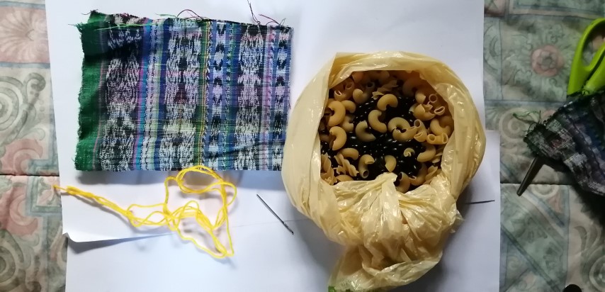 Une los lados de los retazos y cose dejando un lado abierto y rellena con frijoles, arroz, maíz o fideos, después cóselo para hacer una bolsa con granos.