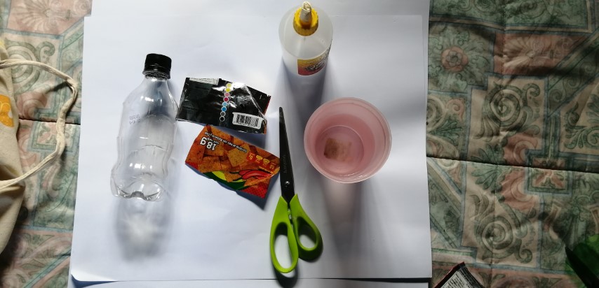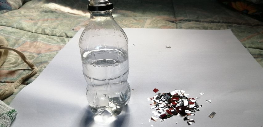 1 botella plástica redonda pequeña (que ruede cuando esté en el piso).