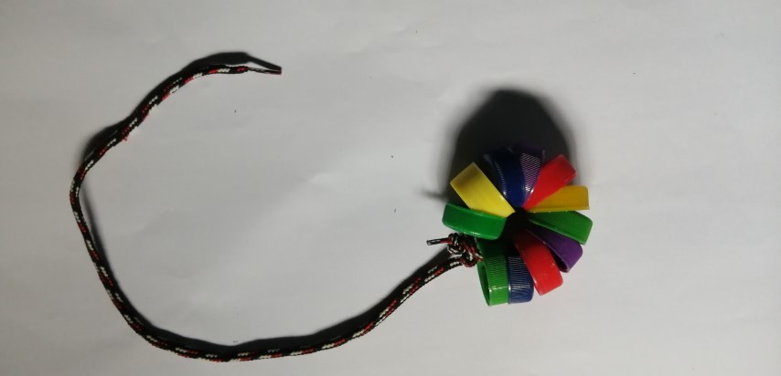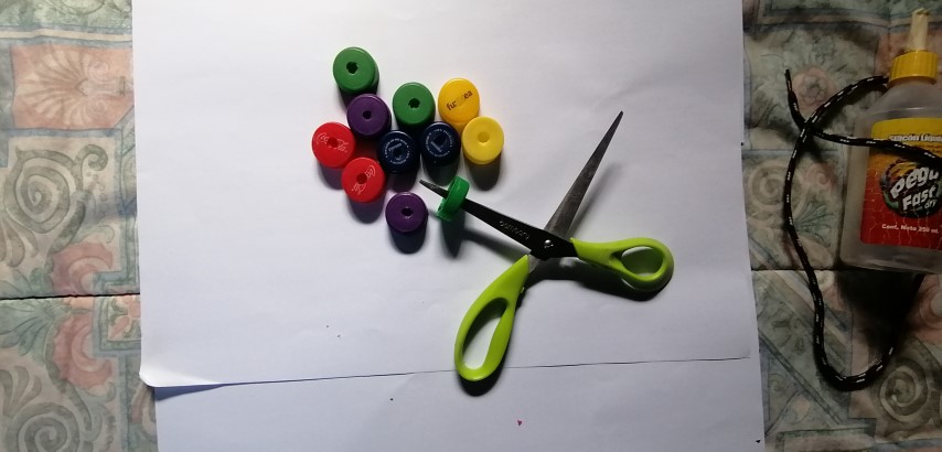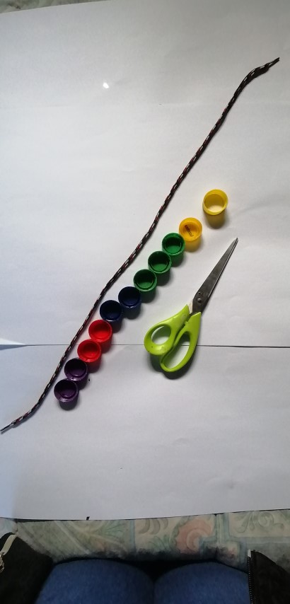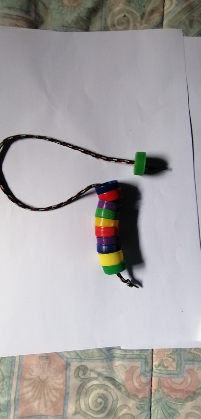 La niña o niño logrará jalar la cadena de colores, uso de sus dedos índice y pulgar para ensartar las tapas en la correa. Conocer, clasificar y agrupar los colores.